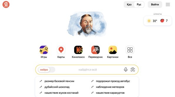 Ко дню рождения великого казахстанского поэта и мыслителя Абая Кунанбаева Yandex Qazaqstan разместил на главной странице Поиска его портрет с цитатами, а также с помощью Карт выяснил, какие объекты в Республике названы в честь классика и сколько их.