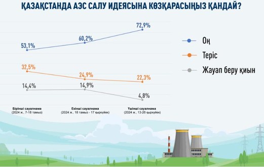 Жалпы респонденттердің басым бөлігі – 72,9%-ы атом электр станциясын салу идеясын қолдайды. «Қазақстанда АЭС салу идеясына көзқарасыңыз қандай?» деген сұраққа респонденттердің шамамен үштен екісі оң көзқарас білдірді.