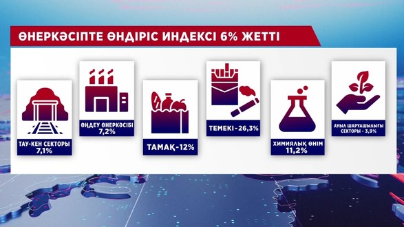 Ал өнеркәсіпте өндіріс индексі 6% жетті. Өсім, әсіресе, тау-кен секторында байқалады. Өзге салаға нақтырақ тоқталсақ, өңдеу өнеркәсібі 7%, тамақ 12%, темекі 26%, химиялық өнімдер мен машина жасау 11% артқан. Ауылшаруашалығына тоқталмай өтуге болмас. Мұндағы өзгеріс — 3,9%.