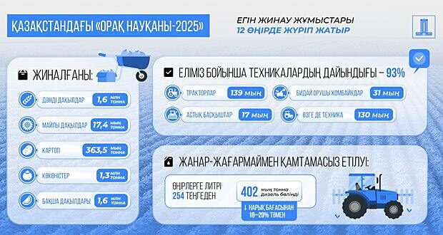 Бүкіл ел бойынша егін жинау науқанына 139 мың трактор, 31 мың астық жинайтын комбайн, 17 мың шапқыш және 130 мың басқа техника тартылатын болады. Бүгінгі таңда жалпы дайындық 93%-ды құрайды.