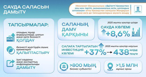 Қабылданған шаралар кешенінің нәтижесінде сала тұрақты өсуді көрсетіп отыр: 2025 жылғы қаңтар–шілде айларында сауда көлемі 8,6%-ға, ал инвестиция көлемі І жартыжылдықта 37%-ға өсіп, 438 млрд теңгеге жетті.