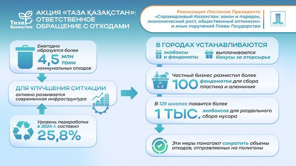 Одним из ключевых направлений Концепции «Таза Қазақстан» является ответственное обращение с отходами. По официальным данным, ежегодно в Казахстане образуется более 4,5 млн тонн коммунальных отходов. При этом уровень переработки в 2024 году составил 25,8%, что требует дальнейших усилий по развитию инфраструктуры и информированию населения.