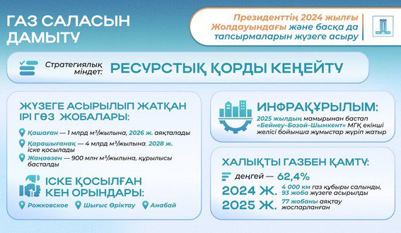 Халықты газбен қамтамасыз етуге келетін болсақ, бүгінгі таңда Қазақстанды газдандыру деңгейі 62,4%-ды құрайды, бұл 20,2 млн халықтың 12,6 млн тұрғынына газға қол жеткізуге мүмкіндік береді. Бұл 2023 жылғы көрсеткіштен 2,4%-ға жоғары. 2024 жылы 4000 шақырымнан астам газ құбыры салынып, 93 жоба жүзеге асырылды.