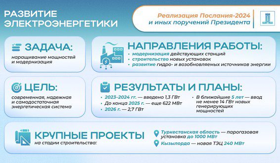 За 2023 и 2024 годы уже введено в эксплуатацию 1,3 гигаватт новых электрических мощностей. В 2025 году идет процесс ввода ещё 621,5 мегаватт, а на 2026 год запланировано 2 648,5 мегаватт. Для достижения этих целей ведется активная работа по строительству новых стратегических объектов. В Туркестанской области реализуется проект по строительству электростанции на базе парогазовой установки мощностью до 1000 МВт. В Кызылорде ведутся строительно-монтажные работы по возведению новой ТЭЦ мощностью 240 МВт.