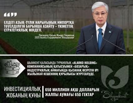 Қазақстан Республикасының Президенті Қасым-Жомарт Тоқаев 2025 жылғы 8 қыркүйектегі Жолдауында азық-түлік қауіпсіздігін қамтамасыз ету және ішкі нарықтың импортқа тәуелділігін азайту Үкіметтің стратегиялық міндеті екенін атап өтті. Осы бағыттағы ірі жобалардың бірі ретінде Шымкент қаласында «Бозарық» индустриялық аймағында жылыжай кешенінің құрылысы жүзеге асырылуда.