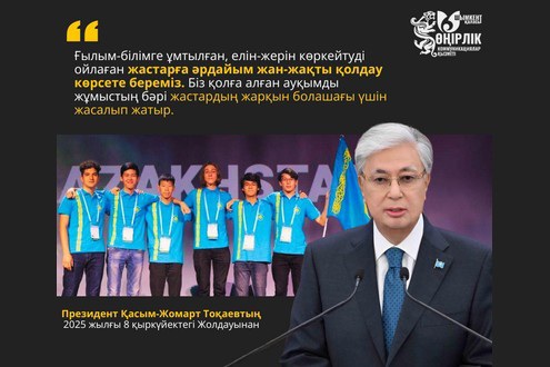 Сонымен қатар, ғылым мен білімге ұмтылған, ел игілігі мен жердің көркеюіне атсалысатын жастарға мемлекет тарапынан жан-жақты қолдау көрсетілетін болады. Қолға алынған барлық ауқымды бастамалар мен жобалар ең алдымен жас ұрпақтың жарқын болашағын қамтамасыз етуге арналған.