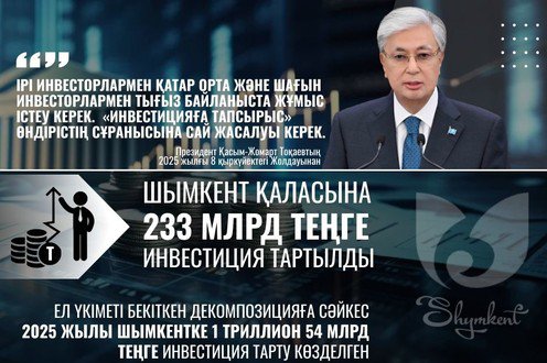 Шымкент қаласының экономикасы соңғы жылдары тұрақты даму үрдісін көрсетіп отыр. Бұл – инвестиция тарту бағытында жүргізілген жүйелі жұмыстардың нәтижесі. 2025 жылдың қаңтар–сәуір айларында қалаға 233 млрд теңге инвестиция тартылып, өткен жылдың сәйкес кезеңімен салыстырғанда 54 пайызға жоғары көрсеткіш тіркелді.