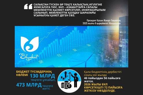 Осы бағытта Шымкент қаласының бюджет түсімдері жыл сайын тұрақты өсіп келеді. Соңғы екі жылдың ішінде қала қазынасы 130 млрд теңгеге артып, 473 млрд теңгеге жетті. Сонымен қатар, бюджет дербестігі 46%-дан 56%-ға көтерілді.