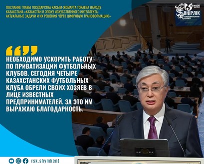 «Необходимо ускорить работу по приватизации футбольных клубов. Сегодня четыре казахстанских футбольных клуба обрели своих хозяев в лице известных предпринимателей. За это им выражаю благодарность», отметил Президент Касым-Жомарт Токаев.
