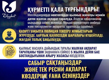 Құрметті тұрғындар! Мессенджерлерде мектептерде қылмыс жасалуы мүмкін деген жалған ақпарат таралуда.