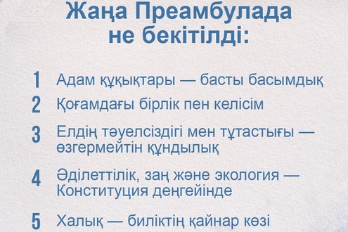 Жаңа Конституцияда әділеттілік, заңға бағыну және қоршаған ортаға қамқорлық қағидаттары алғаш рет конституциялық деңгейде бекітілді. Бұл – заманауи мемлекет пен құқықтық қоғам құрудағы жаңа қадам. Жаңа Конституция бойынша мемлекеттік билік халықтан бастау алады. Яғни, Қазақстан халқы – биліктің бірден-бір қайнар көзі. Осылайша, жаңа Преамбула елдің тарихи дәстүрлері мен заманауи құндылықтарын үйлестіре отырып, Қазақстанның құқықтық, әлеуметтік және экологиялық даму бағыттарын айқындайды.