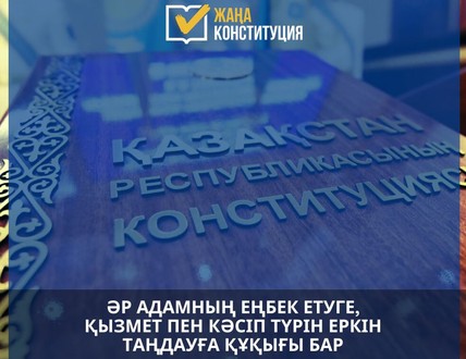 Қазақстан Республикасының жаңа Конституциясында әрбір азаматтың еңбек ету құқығы және қызмет пен кәсіп түрін еркін таңдау мүмкіндігі нақты бекітілген. Бұл норма азаматтардың еңбек саласындағы негізгі құқықтарын қамтамасыз етуге және олардың кәсіби қызметін еркін жүзеге асыруына құқықтық негіз қалыптастырады.