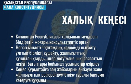 Жаңа Конституция жобасында Қазақстан халқының мүддесін білдіретін жоғары консультативтік орган – Халық Кеңесін құру қарастырылған.