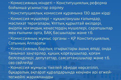 Сонымен қатар, комиссия жұмысы тікелей эфирде көрсетіліп, бұқаралық ақпарат құралдарында кеңінен әрі егжей-тегжейлі жарияланып отырды. Бұл жаңа Конституция жобасының ашықтық, жариялылық және қоғамдық бақылау қағидаттарына сай әзірленгенін айқын көрсетеді.