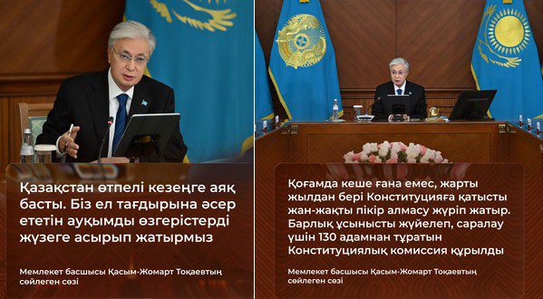 Қазақстан Республикасының Президенті Қасым-Жомарт Тоқаев Үкіметтің кеңейтілген отырысында сөйлеп, елдің өтпелі кезеңге қадам басқанын және ауқымды саяси өзгерістер жүзеге асырылып жатқанын атап өтті.