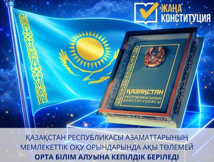 Ата Заңға сәйкес, Қазақстан Республикасы азаматтарының мемлекеттік оқу орындарында ақы төлемей орта білім алуына кепілдік беріледі. Бұл ереже мемлекет тарапынан білім беру саласына қолдау көрсетілетінін және әрбір азаматтың әлеуметтік жағдайына қарамастан орта білім алуға тең мүмкіндікке ие екенін айқындайды.