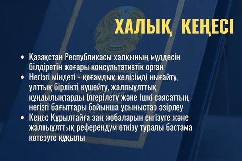 Осылайша, Халық кеңесінің құрылуы қоғамдық келісімді нығайтуға, ұлттық бірлікті сақтауға және мемлекеттік саясаттың тиімді жүзеге асырылуына ықпал ететін маңызды қадам болып табылады.