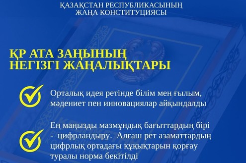 Қазақстан Республикасының жаңа Конституциясында елдің дамуына бағытталған бірқатар маңызды жаңалықтар айқындалды. Ата Заңның мазмұны заманауи талаптарға сәйкес жаңартылып, мемлекеттің стратегиялық басымдықтары нақты көрсетілді.