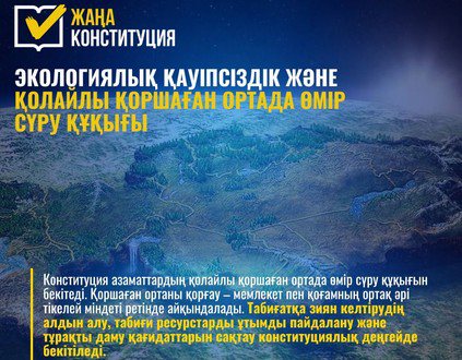 Жаңа Конституция жобасында экологиялық қауіпсіздік мәселесіне айрықша назар аударылған. Құжатта әрбір азаматтың қолайлы әрі қауіпсіз қоршаған ортада өмір сүру құқығы нақты бекітіліп, табиғатты қорғау мемлекеттің ғана емес, бүкіл қоғамның ортақ әрі тікелей міндеті ретінде айқындалған.