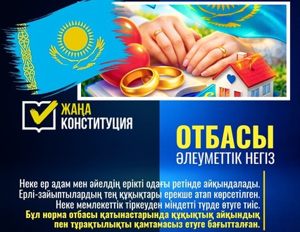 Конституция отбасының маңызды рөлін айқындап, некеге қатысты заңдық нормаларды заманауи талаптарға сай бекітеді. Ерлі-зайыптылар өз өмірін бірлесе жоспарлап, отбасы құндылықтарын қалыптастыруда толық құқыққа ие болады.