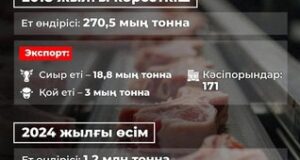 2018 жылдан бері ет өндірісі 270,5 мың тоннадан 2024 жылы 1,2 миллион тоннаға дейін өсті. Экспорт айтарлықтай артты, ал кәсіпорындар саны 171-ден 213-ке дейін ұлғайды. Qazaq.press