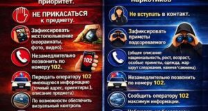 Общие принципы Личная безопасность — приоритет. Категорически ЗАПРЕЩЕНО: прикасаться к подозрительным предметам, самостоятельно задерживать подозреваемых лиц. Все действия должны соответствовать законодательству Республики Казахстан. При обнаружении «закладки» наркотиков 1. Не прикасаться к предмету. 2. Зафиксировать местоположение (координаты, фото, видео,). 3. Незамедлительно позвонить по номеру 102. 4. Передать оператору 102 имеющуюся информацию (точный адрес, ориентиры, описание предмета). 5. По возможности обеспечить визуальный ...